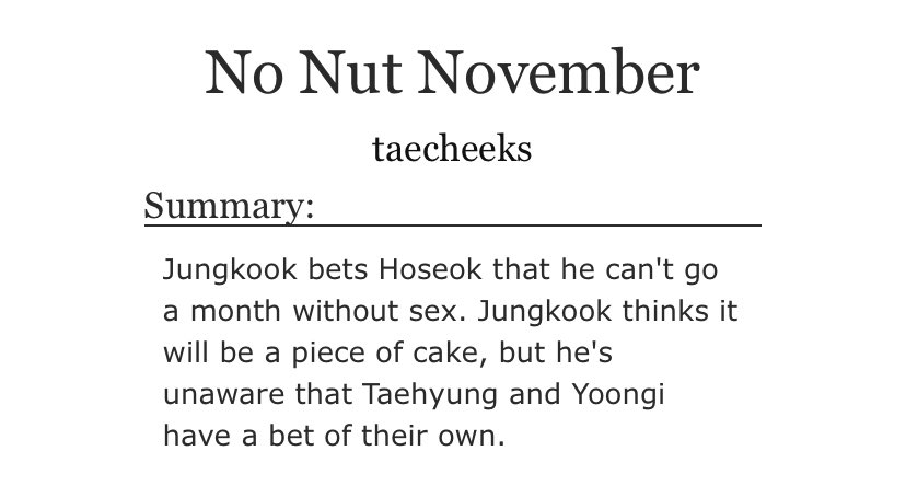 Bts Fic Recs Ao3 Twt On Twitter No Nut November By Taecheeks Taehcheeks Taekook 19k Honestly Taegi Be Doing The Most To Make Their Boyfriends Lose The Bet And I Am Here For